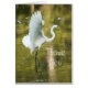 A Great White Egret with it's wings up standing in a shallow river stalking a fish. The reflection of the bird is seen in the still calm waters.