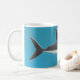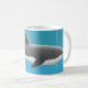 A great white shark swims across a cool blue coffee mug in this original design by Carolyn McFann of Two Purring Cats Studio.
