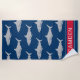 Ferociously cool personalized beach towel design features a nautical navy blue background with an ocean pattern of grey coloured great white sharks. Add a first or last name to the modern all caps custom text space with a simple red striped frame.