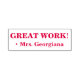 This encouraging rubber stamp design features the motivational message "GREAT WORK!" and a custom teacher's name. It could be used by a teacher, educator, or tutor when marking assignments, to acknowledge that the student has done a great job.