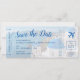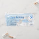 A boarding pass plane ticket destination wedding save the date card for a Santorini, Greece Wedding featuring the iconic blue dome church overlooking the Agean sea and cliffs. Use the design tool for advanced exiting of the design such as changing text colour, font, and placement, and card background and airplane colour. Contact me for coordinating items you are looking for, or use the "transfer this design" to create your own on any Zazzle item.