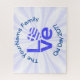Jigsaw puzzle featuring the blue and white Flag of Greece in a heart shape makes the O in the blue lettered word LOVE. Below it reads OXI DAY 20??. You can customize it to say anything you like. Perhaps, FAMILY REUNION 2030 or EASTER 2031? Above, a spot for your family name or any name you wish for added personalization. The word LOVE sits in the centre of a digital art created white, fractal of radiating streaks. Fun gift.