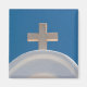A cross on a white church against blue sky. The image was taken on the Island of Naxos, Greece,