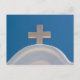 A cross on a white church against blue sky. The image was taken on the Island of Naxos, Greece,