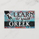 Colourful arty Learn To Speak Greek business cards in turquoise, aqua, red, yellow. Greek language Instruction business cards.