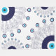 Modern white blanket printed with Greek navy blue, turquoise and white nazar evil eye symbol mandalas