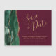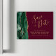 This elegant save the date magnetic card features an emerald green watercolor agate border trimmed with faux gold glitter. The customizable text combines gold-coloured handwriting script, copperplate and italic fonts on a burgundy background.