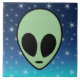 A green alien head with big black oval eyes and a small black slit for a mouth. The background is a dark to light blue gradient colour dotted with white stars.