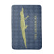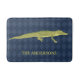 Add a wild personalized touch to your bathroom with this bath mat. This bathmat or tub mat has a realistic style illustration of an alligator in an olive green colour set against a navy blue patterned background and is ready to be personalized with a name in matching olive green lettering.