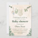 This baby shower invitation features a charming clothesline with soft green and cream-coloured baby items, including a romper, socks, bib, and a plush bunny. The background is a delicate beige with watercolor greenery accents, creating a warm, natural, and inviting design. Perfect for celebrating a new arrival.