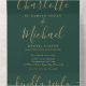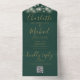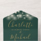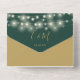 All in one wedding invitation with pretty string lights, signature style names and chic gold typography on an emerald green background. The invitation includes a perforated RSVP card featuring a QR code. Designed by Thisisnotme©