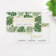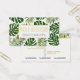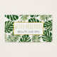 Green and gold tropical leaves business card. It features leaves of Split Leaf Philodendron (Monstera deliciosa) or Swiss Cheese Plant and palm leaves in green with gold outline. Your text is in a white frame with gold outline.
