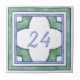 A hand drawn blue and green frame around a green house number with dark blue outlines and a pattern in the corners.