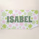 This personalized beach towel features a groovy retro-style floral design in green and pink. It’s ideal for various outdoor activities, whether you're lounging at the beach, enjoying a vibrant pool party, or having a relaxing picnic in the park. These towels not only serve a practical purpose but also make for a heartfelt gift, as they can be customized with the recipient's name.