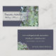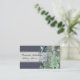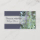 Green hydrangea and purple business card template. Green flowers bloom at the side of this medium size elegant, floral card with a dark purple background and matching text on the front. A white "ribbon" holds lines for name and title on the front, with 4 more lines of text to customize on reverse. You may upgrade the paper type in the box to the right.