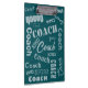 Create a custom-made gift for your favourite coach with the word coach in a variety of fonts in silver on a midnight green background.