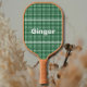 This modern pickleball paddle design features a green and white gingham pattern background, with your name in bold white text for a look that is simple and stylish, yet professional. It makes the perfect gift for Christmas, birthday, Mother's Day, Father's Day, graduation, retirement, and more.