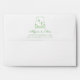 Return Address envelope design. The liner features a light green and white Greek Key pattern with a watercolor wedding crest decorated with white hydrangeas. All watercolor elements originally handpainted by me before being scanned into digital form. The reverse flap has the name/ return address in green, and a smaller version of the crest.