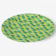 This party paper plate features squares in different shades of green and yellow in a pixelated pattern resembling 16 bit graphics in popular video games.