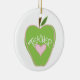 An ornament for teachers featuring an illustration of a green apple decorated with a pink border, a pink heart, and white text that says "TEACHER."