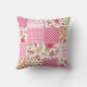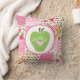 A pillow for teachers featuring an illustration of a green apple decorated with a pink heart and white text "TEACHER." Background is a girly patchwork inspired design consisting of polka dot, paisley, stripes, zigzag, floral, and gingham patterns.