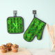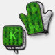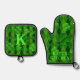 Irish green kitchen mitt and pot holder set. Four-leaf clovers pattern over green argyle print. Personalize with name on mitt and initial on pot holder, in bright lime green. This unisex design makes a great gift for anyone.