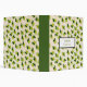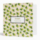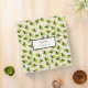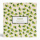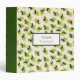 A binder with a green avocado pattern created with watercolor paint. This design has one pear-shaped avocado with stem and leaves intact and the other avocado is cut in half exposing its pit. Sitting on a bed of leaves. A rectangle frame layered over top so you can personalize with a name and subject title.