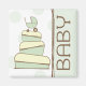 A magnet featuring an illustration of a baby shower cake with a green, brown, and cream colour scheme with matching green baby carriage on top. Right side is green with brown trim. Brown text reads "BABY." Background is sheer green polka dots. Great for a baby shower favour. Look for matching invitations and postage in the "Baby" category of Jill's Paperie.