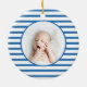 Elegant, modern and cute baby photo Christmas ornament on blue stripe pattern. This template featuring an adorable illustration of Green baby dinosaur sleeping under the gold yellow stars with custom Baby's name. Reverse to reveal a lovely baby photo in red stripe circle frame. Great for both baby boy and girl. Perfect gift for all seasons!