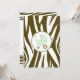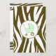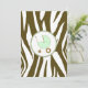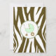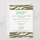 An invitation featuring a brown zebra print border across top and bottom with light green trim. Personalize the brown and green tango and blackletter font text with details of your event. Opposite side is solid zebra print with a green baby carriage inside a matching circle shaped frame.