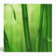 A lush emerald green image of bamboo stalks with long delicate leaves and pale bokeh lights in the background.