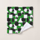 Ce kit de serviettes a une conception Bauhaus de triangles, cercles, rectangles et pentagons en noir et blanc sur un champ de vert.