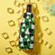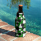 This bottle cooler has a Bauhaus design of triangles, circles, rectangles, and pentagons in black and white on a field of green.