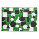 This pillowcase has a Bauhaus design of triangles, circles, rectangles, and pentagons in black and white on a field of green.