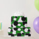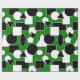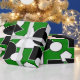 This wrapping paper has a Bauhaus design of triangles, circles, rectangles, and pentagons in black and white on a field of green.