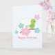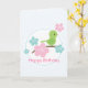Kawaii green bird illustration on a branch of tree with blue and pink cherry blossom flowers around. Background is made of light blue and white diagonal stripes and a white label written "happy birthday" (you can change this text).