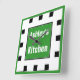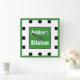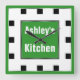 Modern 10.75" x 10.75" wall clock with green and black squares, personalized with your own text, and a perfect custom touch for any kitchen, bedroom, dorm room, etc.