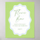 The sign features a fresh summer green background, offering a fresh and inviting canvas that exudes the warmth and vibrance of a blooming garden. Encircling your bridal shower details is a delicate sky blue scalloped frame, adding a touch of whimsy and elegance. This unique design element creates a delightful addition to the green backdrop, infusing the sign with a sense of playful sophistication.