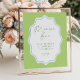 The sign features a fresh summer green background, offering a fresh and inviting canvas that exudes the warmth and vibrance of a blooming garden. Encircling your bridal shower details is a delicate sky blue scalloped frame, adding a touch of whimsy and elegance. This unique design element creates a delightful addition to the green backdrop, infusing the sign with a sense of playful sophistication.