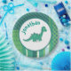 Cute smiling dinosaur in round frame. Personalized name dino, blue green, teal colourful pattern for boys
