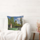 Photo throw pillow with a small green boat and a wooden cabin with some tall trees at the edge of the water in a fjord landscape in Byglandsfjord, Norway.