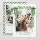 Wish your family and friends a Merry Christmas with a personalized green bow Christmas photo Christmas card showcasing your family on the front underneath a Christmas garland draped with a velvet green bow, and a back side with 3 family pictures and an editable note in a portrait orientation.
