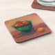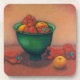 Coasters with contemporary modernist art of green bowl with fruits and vegetables.