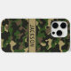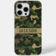 Customize this multi-hued green and brown camouflage iPhone 15 pro case with your name in a trendy modern CAP font in brown on khaki. It's masculine and perfect for your favorite military, hunting, country or outdoorsman!