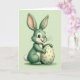 Designed with a soft, springtime look, this illustration features a cartoon-style bunny holding a large egg close, as if guarding it with gentle care 🐰. The bunny has emerald-green fur, long alert ears, and wide, curious eyes that seem to linger on the egg with a tender, affectionate focus. A small smile with a hint of tongue adds a friendly, companionable mood, like it’s sharing a quiet joke with someone just out of view. The background is a smooth pastel green field, keeping the scene calm and letting the character stand out. Centered near the top, simple Easter text appears in a light tone that contrasts softly against the green, staying easy to read without overpowering the art 🌷. The egg is creamy pale yellow and oversized, tucked under the bunny’s forepaws in a close, almost hug-like pose. Mint-green dots scatter across the egg’s surface, and the bunny’s fluffy white tail peeks out along the lower edge.