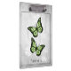 Jot down notes and reminders on a secure surface with a Green Butterfly Floral Personalized Clipboard. Clipboard design features a pair of vibrant butterflies resting on a white floral vine against a light grey grunge background. Additional gift items available with this design as well as a variety of colours.