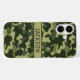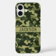 Customize this multi-hued green camouflage iPhone 16 case with your name in a trendy modern CAP font in dark green on light green. It's masculine and perfect for your favorite military, hunting, country or outdoorsman!