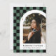 This modern and unique graduation announcement features a green and black chequered background highlighting a photograph of the graduate framed in a white arch with the graduate's name and school beneath. A small gradation cap is cleverly displayed in the checked background with the graduate's graduation year. The back has a fun matching checked pattern in sage green and black.