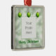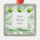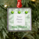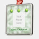 3 Green Christmas ornaments on a shimmery background. Customizable text says "Merry Christmas".
