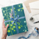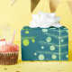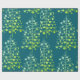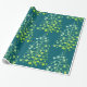 A sophisticated and festive forest green wrapping paper for the holidays featuring crinkled green Christmas trees laden with crinkled green ornaments on a solid rich teal blue coloured background.